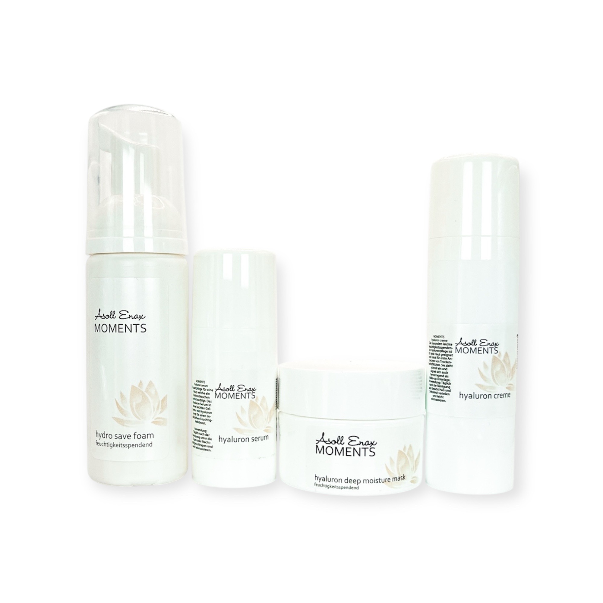 Das Moments Reiseset vereint vier perfekt aufeinander abgestimmte Essentials für eine rundum gepflegte Haut – auch auf Reisen. Hochwertige Wirkstoffe wie Hyaluronsäure, Panthenol, pflanzliche Extrakte und wertvolle Algen sorgen für Feuchtigkeit, Schutz und Regeneration – Tag und Nacht.
